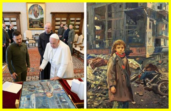 Zelenskyy presented the pontiff with a painting depicting a child among the ruins in the Ukrainian city of Bucha.