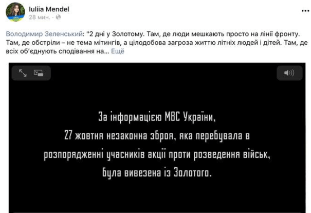 Прес-секретар президента Юлія Мендель заявила, що з Золотого вивезли всю зброю, що було з добровольців: і легальне, і не враховане.