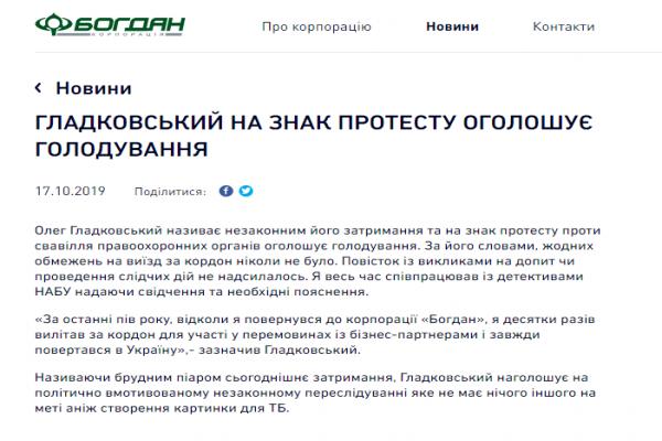 Затриманий сьогодні екс-заступник глави Ради нацбезпеки і оборони України Олег Гладковський (Свинарчук) оголосив голодовку.