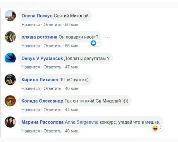 У коментарях користувачі мережі чи то жартома, чи то всерйоз пишуть, що в таких мішках депутати від «Слуги народу» отримують зарплату. Є й ті, хто пов’язав такий знімок з наближенням Нового року і днем ​​Святого Миколая. На їхню думку, вусатий чоловік приніс нардепам подарунки.