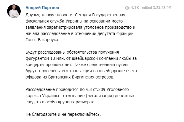«Друзі, погані новини. Сьогодні Державна фіскальна служба України на підставі моєї заяви зареєструвала кримінальне провадження і почала розслідування відносно депутата фракції Голос Вакарчука. Будуть розслідувані обставини отримання фігурантом 13 млн. Від швейцарської компанії нібито за концерти минулих років», написав юрист