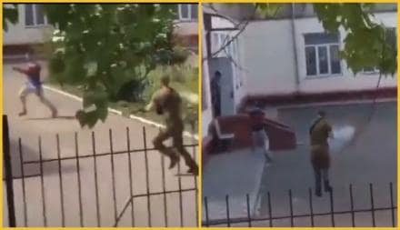 На записи предоставленного ролика, можно увидеть как неизвестный парень бегал по двору школы, пытаясь скрыться от трех вооруженных охранников.