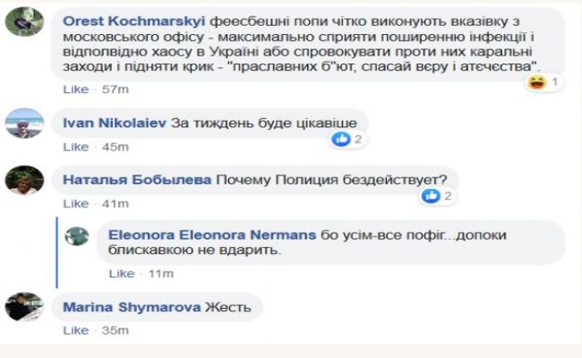 «Феесбешние попи чітко виконують вказівку з московського офісу — максимально сприяти поширенню інфекції і відповідного хаосу в Україні або спровокувати проти них каральні заходи і підняти крик -«праславніх б’ють, рятуй віру і атечества»» , — написав один з користувачів Facebook.