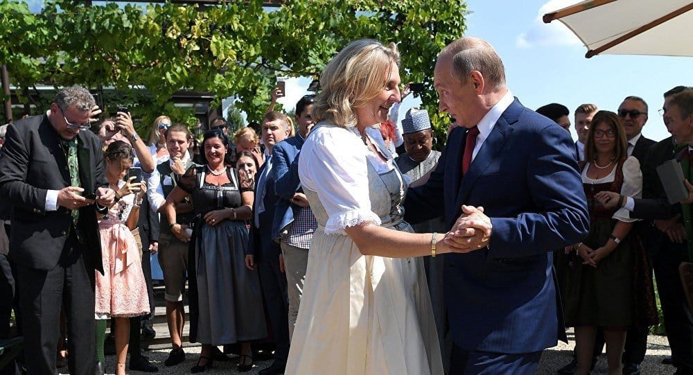В сети интернет опубликовано видео, на котором президент России Владимир Путин танцует с невестой, главой министерства иностранных дел Австрии Карин Кнайссль на ее свадьбе. Видео обнародовано на Facebook телеканала RT на русском.