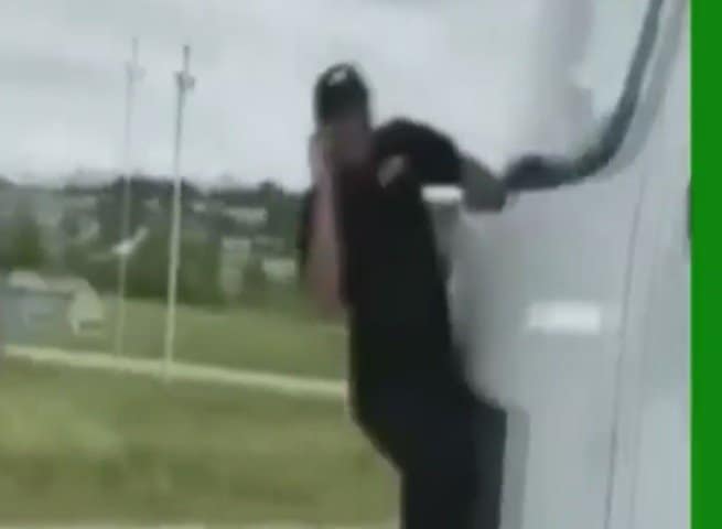 По непонятным причинам водитель грузовика решил наехать на инспектора (возможно, имел место перегруз фуры и ему грозил штраф). Однако тот не только не испугался, но смог удержаться и даже позвонил по мобильному в полицию.