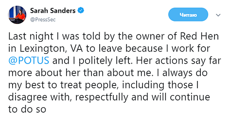 «Вчера вечером хозяйка ресторана Red Hen в Лексингтоне (штат Вирджиния) попросила меня уйти, потому что я работаю на Трампа, и я вежливо ушла. Ее действия больше говорят о ней, чем обо мне», — написала Сандерс в субботу 23 июня в своем микроблоге в Twitter.