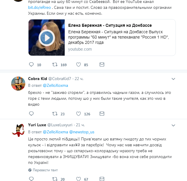 «Як таке може бути? У Києві 49-я школа проходив рашістскій шабаш. На лінійці в незміцнілі уми школярів вливається ватно-сатанинська пропаганда щодо подій в Одесі. Де СБУ? Це їхній клієнт. Діяльність цієї колорадській самки спрямована проти держави Україна », — прокоментував подію блогер. Відзначимо, що його пост викликав масу гнівних коментарів.