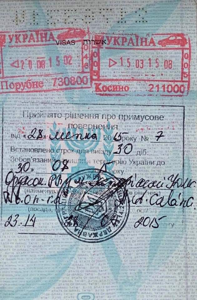 «Щоб спростити старання тих, хто хоче встановити істину, надаю фото сторінки паспорта, на якій стоїть штамп про прийняття державною прикордонною службою України в липні 2015 року рішення про примусове повернення, тобто висилку громадянина Ізраїлю Куницького з території України» — повідомляє на своїй сторінці в Фейсбук народний депутат Андрій Денисенко.