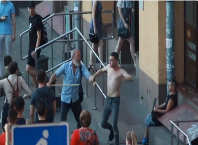 У мережу потрапило відео, на якому видно, як літній чоловік провчив молодого хлопця, справляти нужду в центрі Києва на очах у багатьох людей. Відео опублікував користувач Twitter Роман Рябчук.