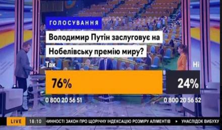 Скандалом закінчився прямий ефір, та опитування глядачів на українському телеканалі НАШ. Глядачам телеканалу поставили питання, чи гідний президент РФ Путін Нобелівської премії миру.