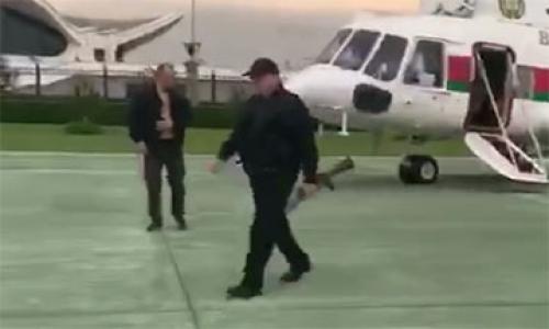 Президент Білорусії Олександр Лукашенко вийшов з автоматом в руках з вертольота, який приземлився біля Палацу незалежності в Мінську, робочої резиденції президента, пише Telegram-канал «Пул Першого».