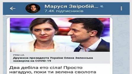 Волонтер, ветеран АТО Маруся Звіробій (Олена Біленька), коментуючи інформацію про інфікування на COVID-19 першої леді України, подружжя Володимира Зеленського Олени, заявила, що українців не цікавить здоров’я президентської сім’ї та пророкує їй долю царської сім’ї.