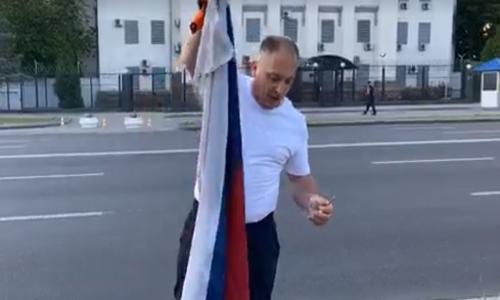 Мер Конотопа спалив російський прапор перед посольством РФ у Києві