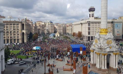 У натовпі, що зібрався перед сценою, майорять прапори України, «Правого сектора», а також плакати з критикою президента. Охорону порядку забезпечує поліція діалогу, але її зовсім небагато — до сотні людей, також чергує швидка допомога.
