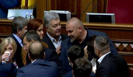 Оппозиционные фракции пошли блокировать трибуну, причем с забавной коалицией Петр Порошенко (ЕС) и Вадим Рабинович (ОПЗЖ).