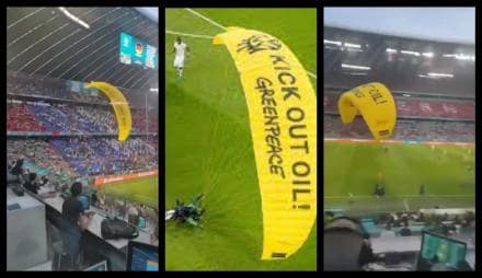 В начале вчерашнего поединка группового этапа Евро-2020 между Германией и Францией, который проходил в Мюнхене, на футбольную арену залетел активист Greenpeace на параплане.