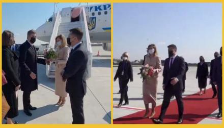 Самолет с Зеленскими только прибыл во Францию. Зеленский придерживал супругу за руку до самой последней ступеньки трапа. Первая леди Украины надела белый костюм с баской, президент отдал предпочтение черному костюму с галстуком.