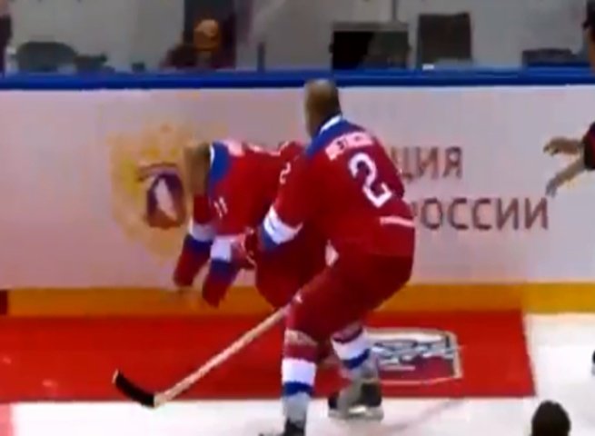 Владимир Путин завалился на лед во время того, как проезжал по кругу ареной и на ходу приветствовал зрителей хоккейного матча в Сочи. Хоккеисты, которые ехали за ним начали помогать ему подняться.