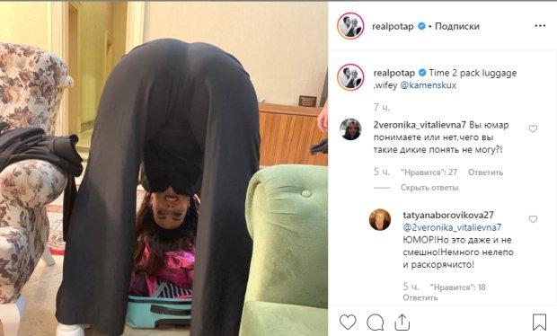 У центрі кадру розташовані сідниці знаменитості, а її голова майже лежить на розкритому валізі. Шанувальники Потапа назвали фото «жахливим» і «принизливим».